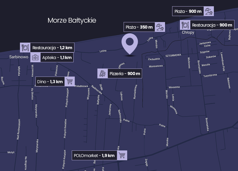Inwestycja znajduje się w Sarbinowie przy ul. Leśnej 10. Do centrum tej spokojnej nadmorskiej miejscowości możesz dotrzeć pieszo w mniej niż 15 minut. Wiele niezbędnych na co dzień lokalizacji, takich jak sklepy czy punkty usługowe, będziesz mieć w odległości krótkiego spaceru. Samochodem szybko dotrzesz również do popularnych kurortów wypoczynkowych – Mielna lub Kołobrzegu – z szeroką ofertą gastronomiczną, rozrywkową i handlowo-usługową